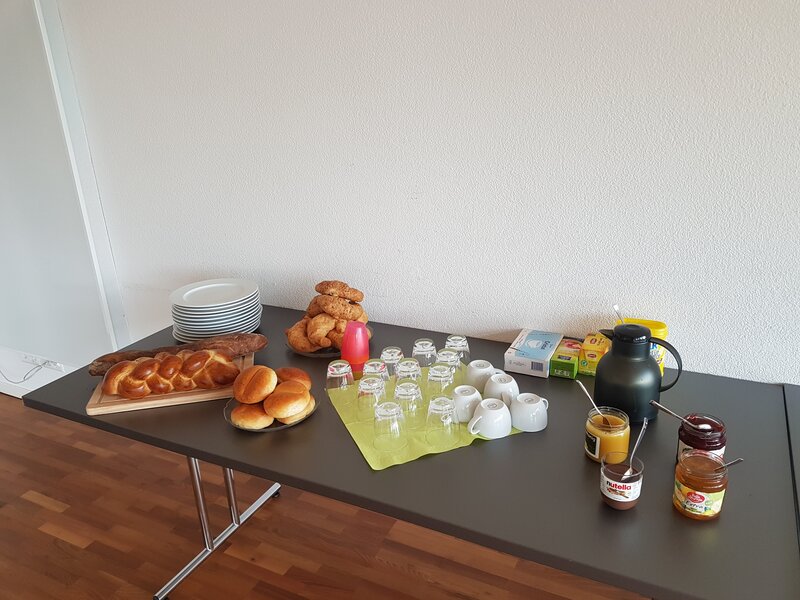 Wir bieten einen reichhaltigen Brunch an mit verschiedenen Broten, Konfitüre, Joghurt, Fleisch, Käse, Orangensaft, diversen Teesorten und Kaffee.